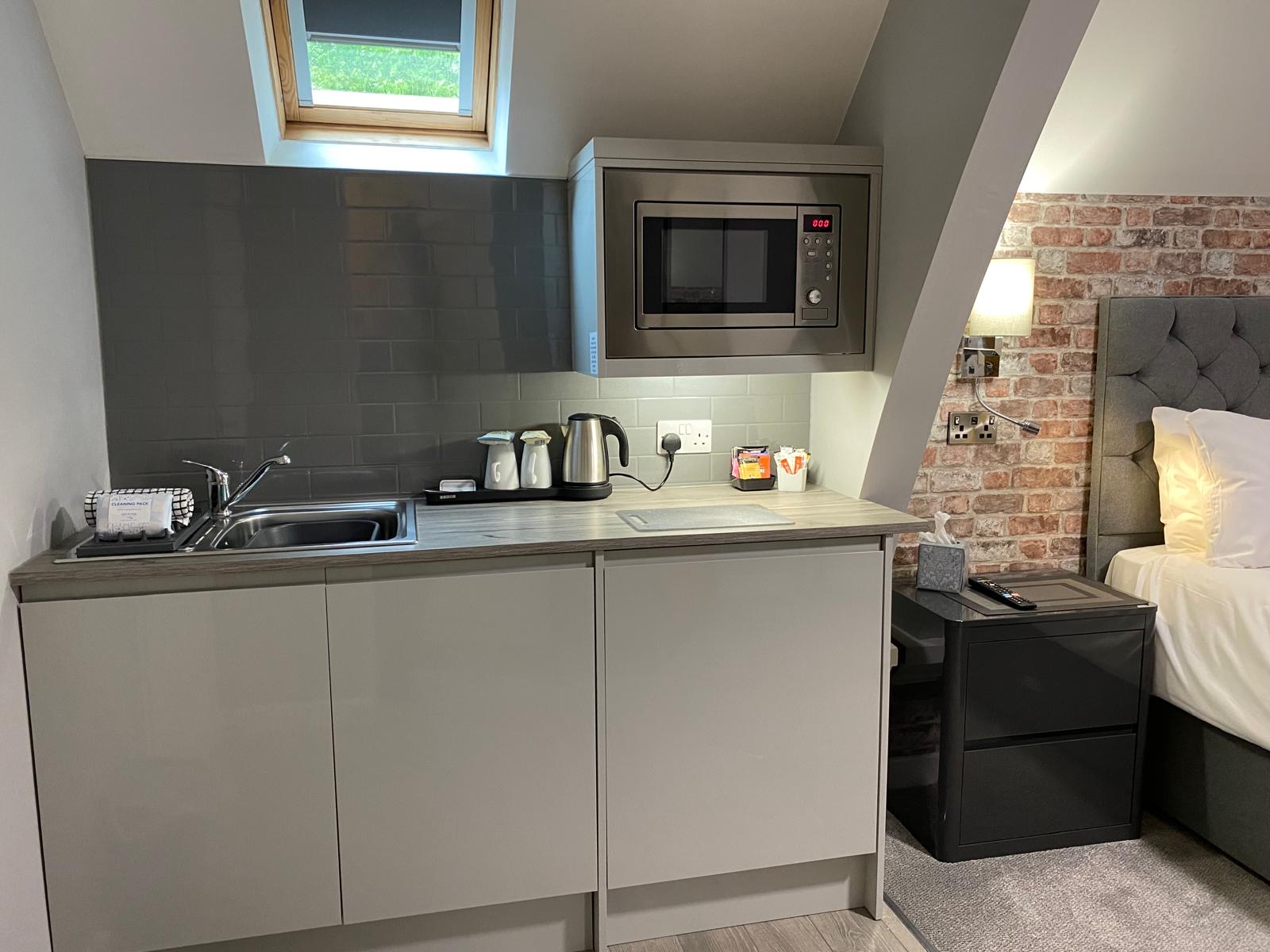 Our Double Room with Kitchenette has a comfortable double bed, en-suite with shower, smart TV, Tea/Coffee making facilities, under counter fridge, built in Microwave, sink and small breakfast bar area with 1 chair and tableware for 2 people.
